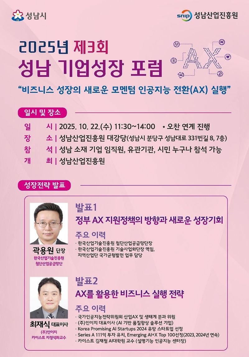 [PEDIEN] 성남산업진흥원이 성남시 중소기업의 성공적인 인공지능 전환(AI Transformation)을 실질적으로 지원하기 위해 오는 10월 22일 '인공지능 전환 실행 전략'을 주제로 제3회 성남기업성장포럼을 개최한다.