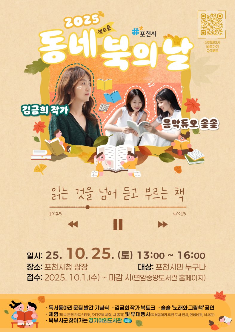 이 외에도 독서동아리 추천 도서 전시, 오디오북 체험, 시 뽑기, 스티커사진관 등 온 가족이 함께 즐길 수 있는 다채로운 부대행사가 마련된다. 백영현 포천시장은 “인문도시의 가치를 높이는 독서동아리 활동을 응원하며, 이번 행사가 더 많은 시민이 책을 통해 교류하고 성장하는 계기가 되기를 기대한다”고 밝혔다.