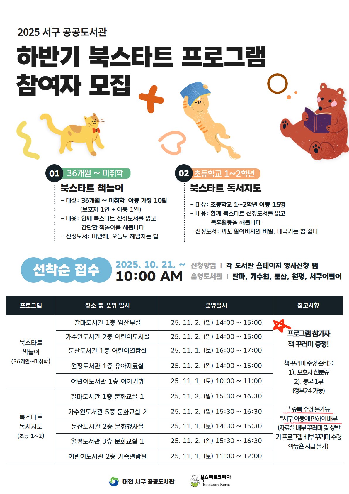 서구 관계자는 “책과의 첫 만남이 아이 인생의 중요한 출발점이 되기를 기대한다”며 “도서관을 넘어 가정에서도 독서가 자연스럽게 이어지는 계기가 될 것”이라고 밝혔다. 자세한 사항은 갈마, 가수원, 둔산, 월평, 어린이도서관 등 관내 5개 도서관으로 문의하면 된다.