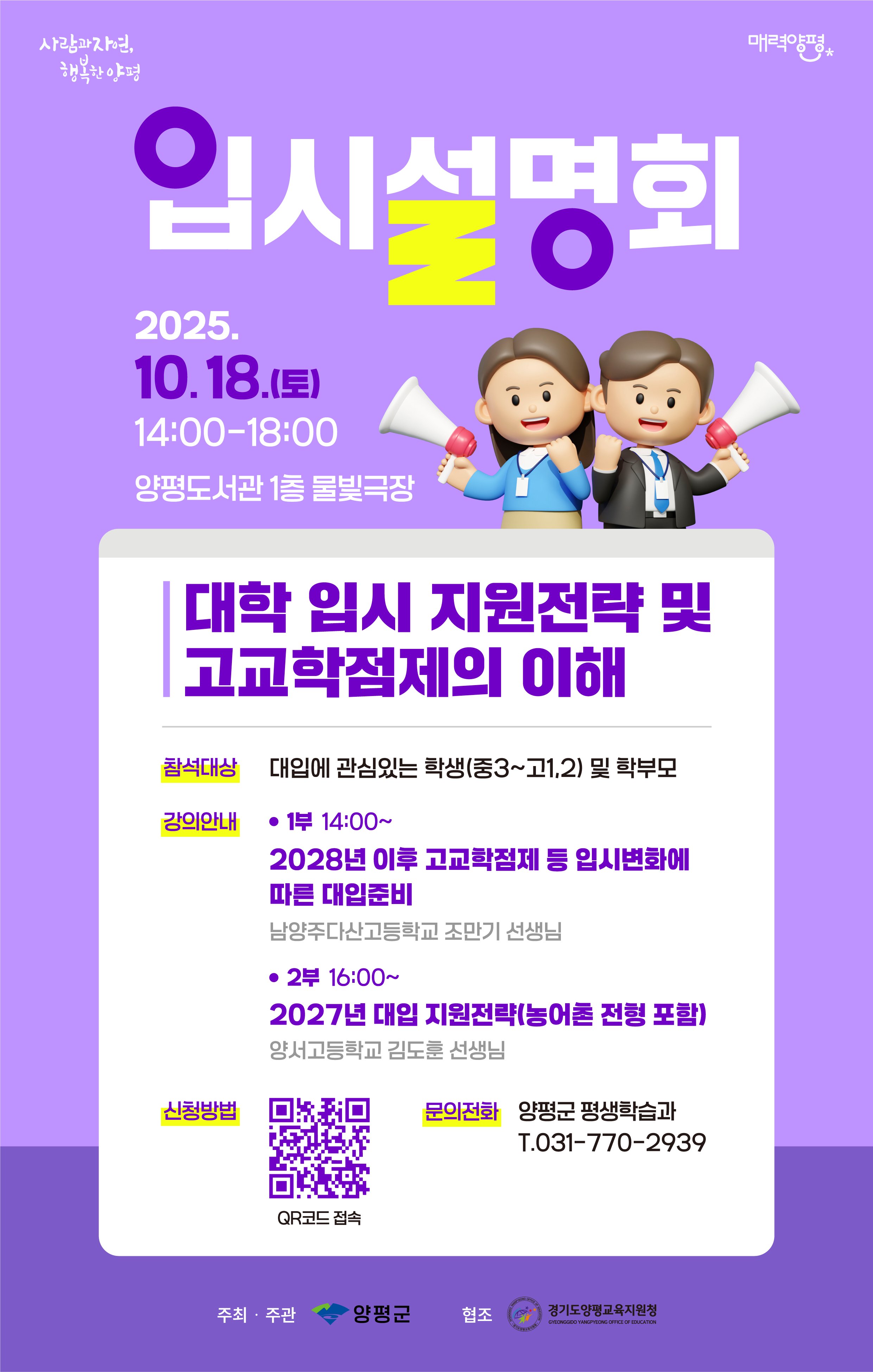 전진선 양평군수는 이번 설명회가 “지역 학생들과 학부모들이 변화하는 입시 제도를 정확히 이해하고 성공적인 대입 전략을 수립하는 데 실질적인 도움이 되기를 기대한다”고 강조했다. 설명회 참여를 희망하는 경우, 포스터 하단의 정보무늬(QR 코드)를 통해 사전 신청해야 한다.