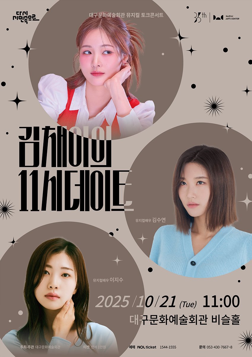 [PEDIEN] 대구문화예술회관(DAC)이 올가을, 뮤지컬 스타들과 함께하는 특별한 토크 콘서트 시리즈의 대미를 장식한다. DAC는 오는 10월 21일 오전 11시 비슬홀에서 ‘김채이의 11시 데이트’ 10월 공연을 개최한다고 밝혔다.