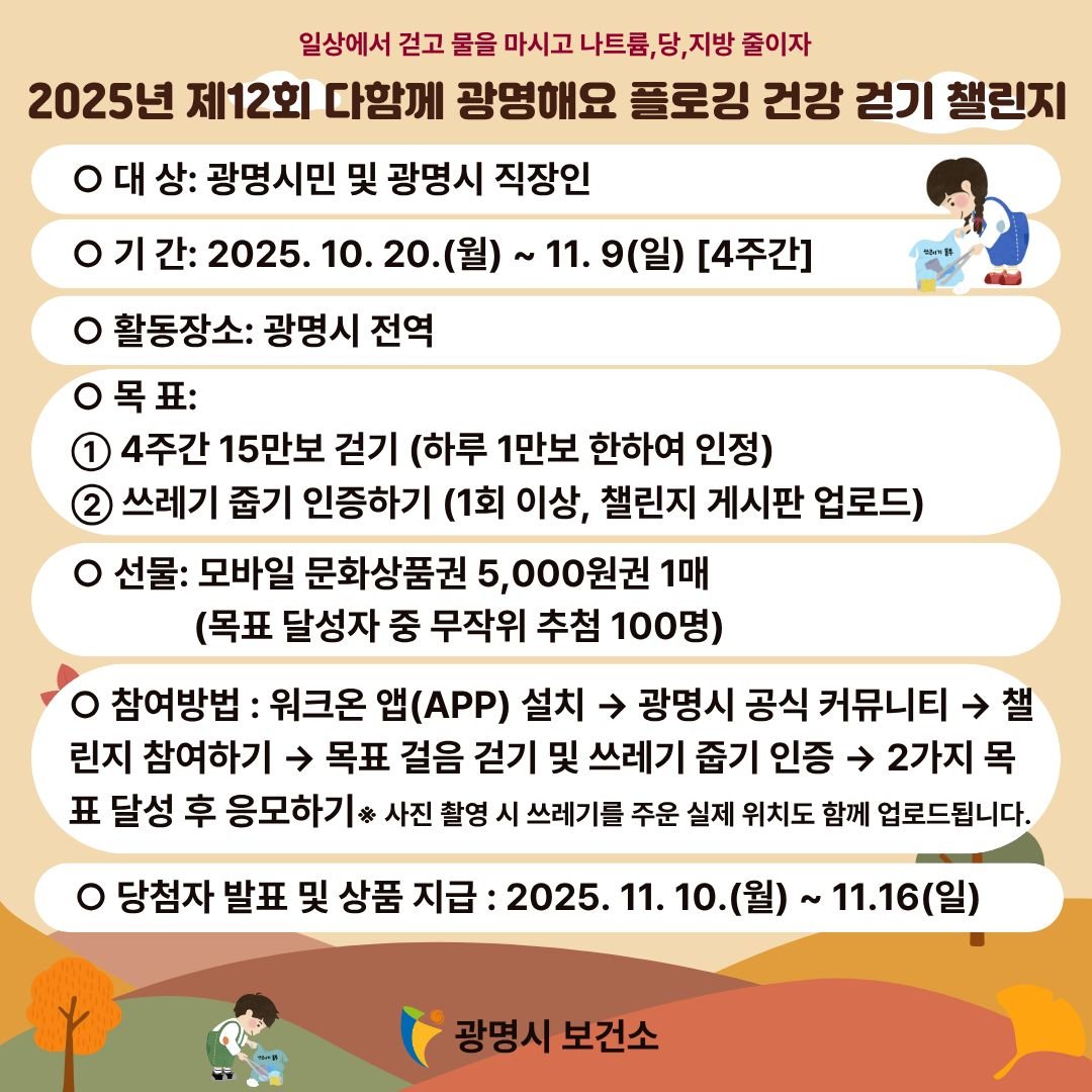 [PEDIEN] 광명시가 시민 건강 증진과 일상 속 환경 보호를 결합한 이색 캠페인에 돌입한다. 시 보건소는 오는 20일부터 11월 9일까지 4주간 ‘제12회 다함께 광명해요! 플로깅 건강 걷기 챌린지’를 운영한다고 17일 밝혔다.