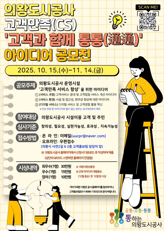 [PEDIEN] 의왕도시공사가 시민과 시설 이용 고객의 목소리를 직접 듣고 고객 만족(CS) 서비스를 혁신하기 위한 아이디어 공모전을 개최한다. 이번 공모전은 '고객과 함께 통통()'이라는 이름으로 진행되며, 시민 참여를 통해 실질적인 서비스 개선 방안을 모색하는 데 중점을 뒀다.