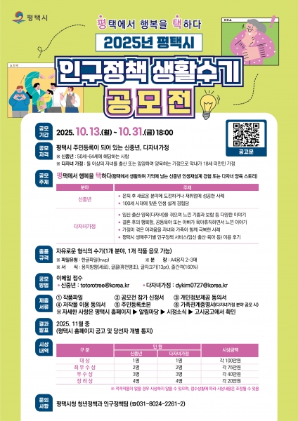 [PEDIEN] 평택시는 2025년 평택시 인구정책 생활수기 공모전 ‘평택에서 행복을 택하다’를 오는 10월 31일까지 개최한다고 밝혔다.