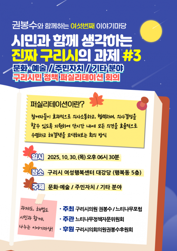 [PEDIEN] 권봉수 구리시의원과 느티나무포럼이 주최하는 ‘권봉수와 함께하는 여섯번째 이야기 마당’ 이 오는 10월 30일 오후 6시 30분에 구리시 여성행복센터 대강당에서 개최될 예정이다.
