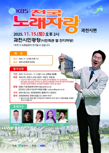 신계용 과천시장은 “전국노래자랑은 전 세대가 함께 즐길 수 있는 국민 프로그램인 만큼, 많은 시민이 무대에 도전하고 또 현장을 찾아 관람하며 함께 즐겨주시길 바란다”며 “과천 시민이 하나 되는 흥겨운 축제가 되길 기대한다”고 전했다.