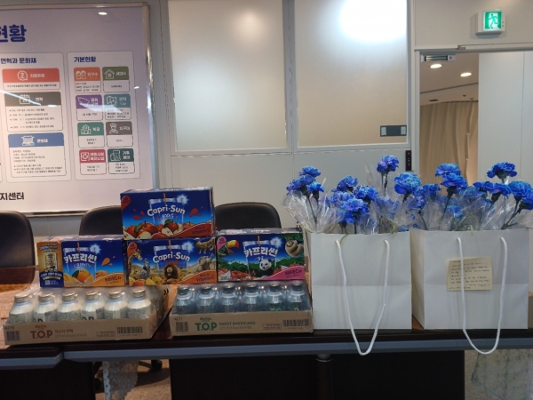이날 오전, 이천경찰서 창전지구대와 증포지구대 앞에는 누군가가 놓고 간 파란색 카네이션 50송이와 캔커피 2박스, 드링크 4박스가 발견됐다.