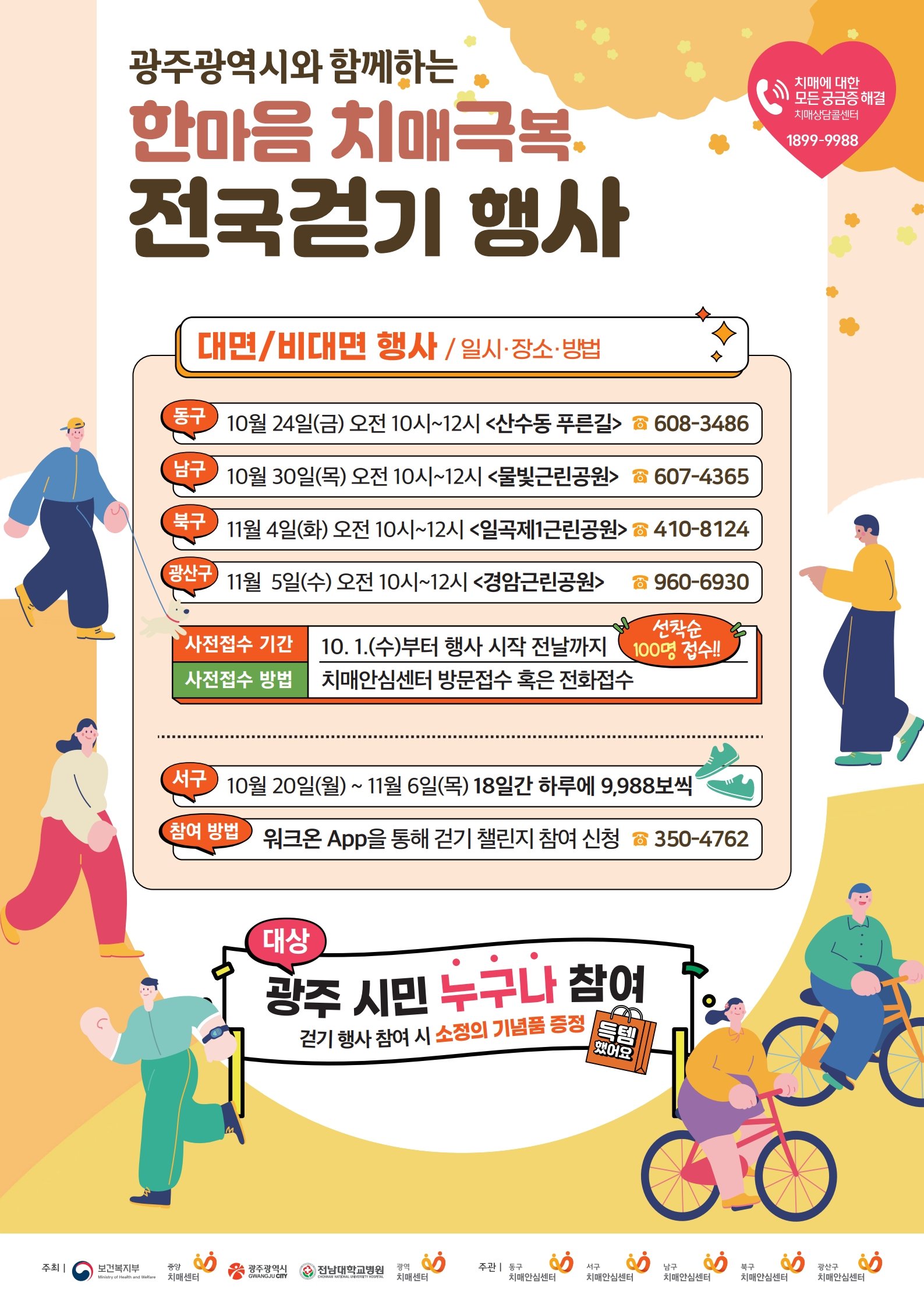 서구는 '일평균 9988보 걷기' 목표 달성 시 지역 취약계층 치매환자 가구를 위한 기부금을 적립하는 행사도 병행하고 있다. 광주시는 5개 자치구 보건소 치매안심센터를 통해 치매 환자와 보호자를 위한 다양한 지원 사업을 펼치고 있다.