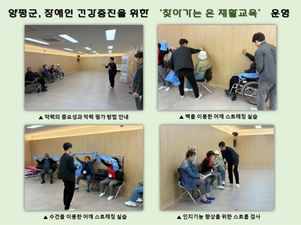 [PEDIEN] 양평군은 지역 장애인의 건강 증진과 재활 역량 강화를 위해 23일과 30일 양일간 ‘찾아가는 온 재활교육’을 운영한다고 밝혔다.