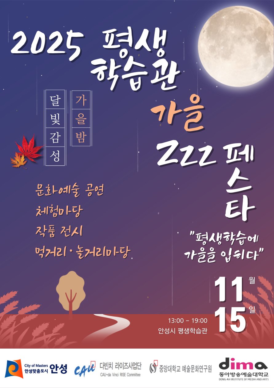 [PEDIEN] 안성시가 오는 11월 15일 안성시 평생학습관에서 추절기 평생학습축제를 개최한다. 이번 축제는 '지금까지의·지금의·지금부터의'라는 주제로, 시민들의 평생학습 참여를 활성화하고 평생학습도시 안성의 위상을 높이기 위해 마련됐다.