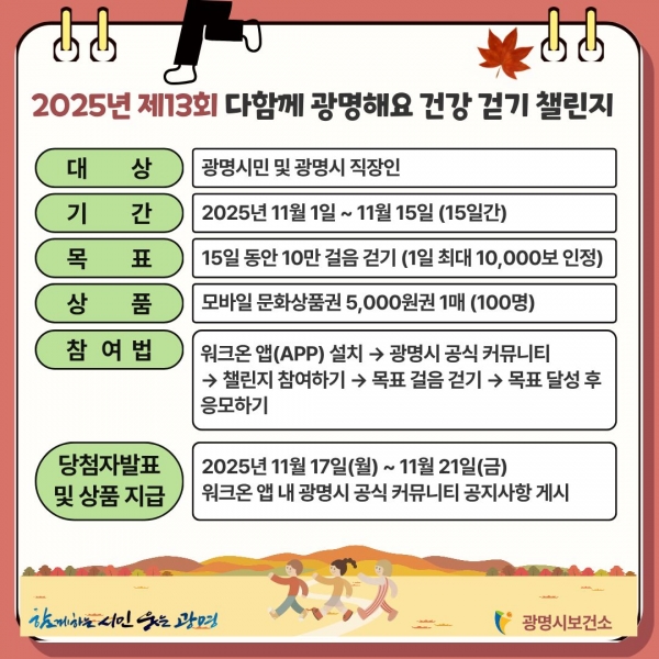 [PEDIEN] 광명시는 시민들의 건강한 생활습관 형성과 걷기 문화 확산을 위해 ‘제13회 다함께 광명해요 건강 걷기 챌린지’를 진행한다.