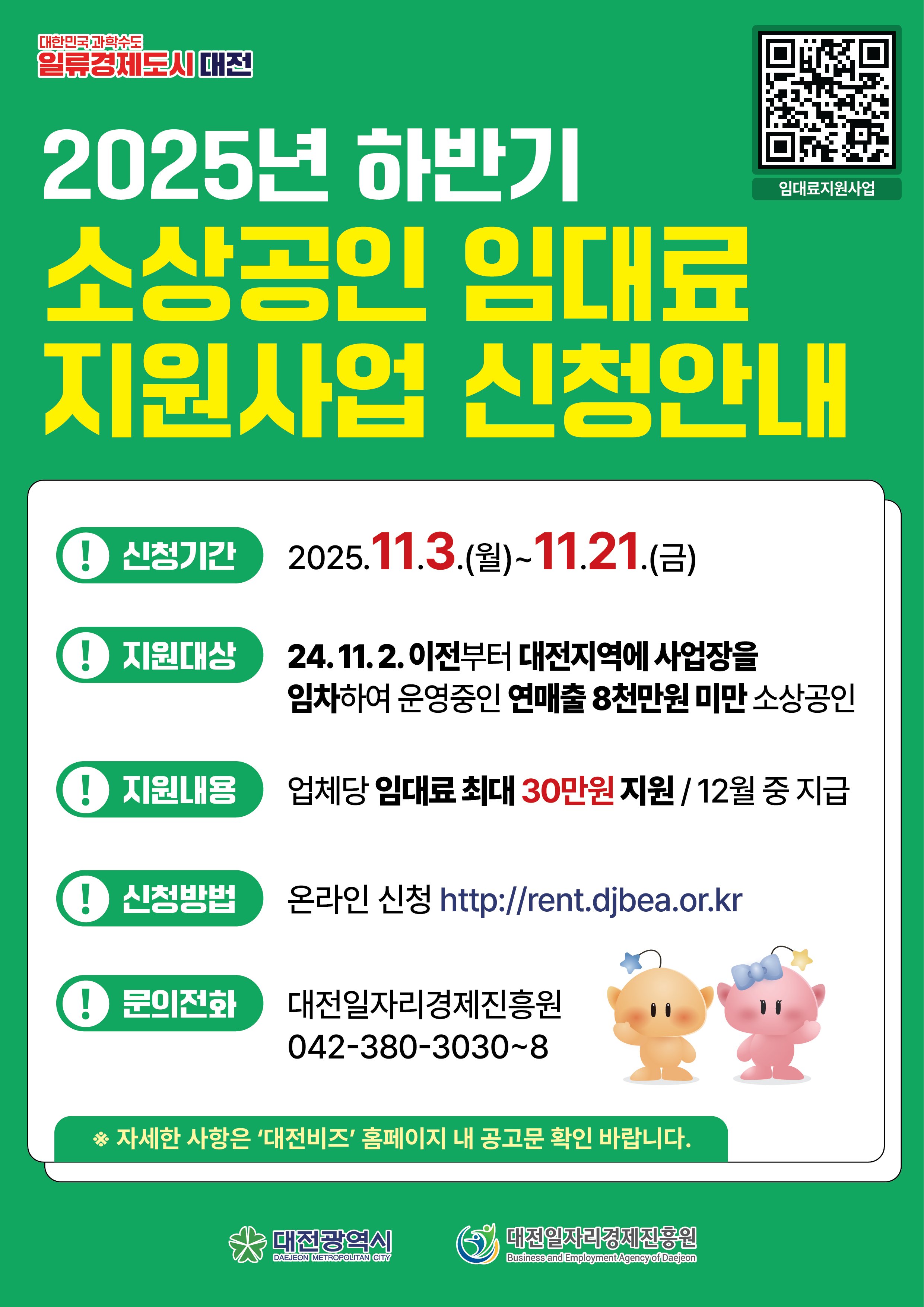 신청 기간은 11월 3일부터 21일까지이며, 온라인으로 접수 받는다. 신청 대상은 공고일 기준 1년 이상 대전시에서 사업장을 임차해 운영 중인 소상공인으로, 연 매출액이 8천만원 미만이어야 한다.