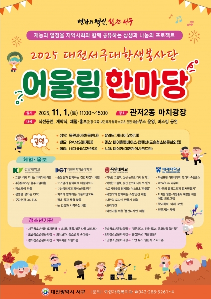 [PEDIEN] 대전 서구는 오는 11월 1일 관저2동 마치광장에서 ‘대전서구대학생봉사단 어울림한마당’ 행사를 개최한다.
