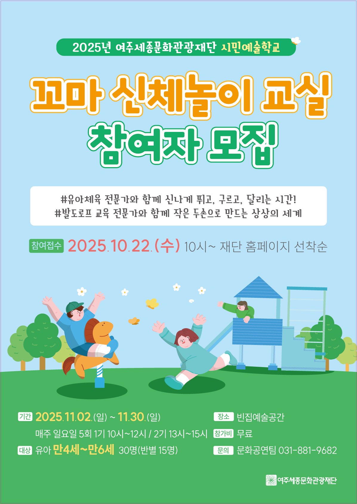 [PEDIEN] 여주세종문화관광재단(이사장 이순열)은 오는 11월 1일(토)부터 한달간 여주의 어린이들을 위한 문화예술교육 프로그램 2건을 진행한다.