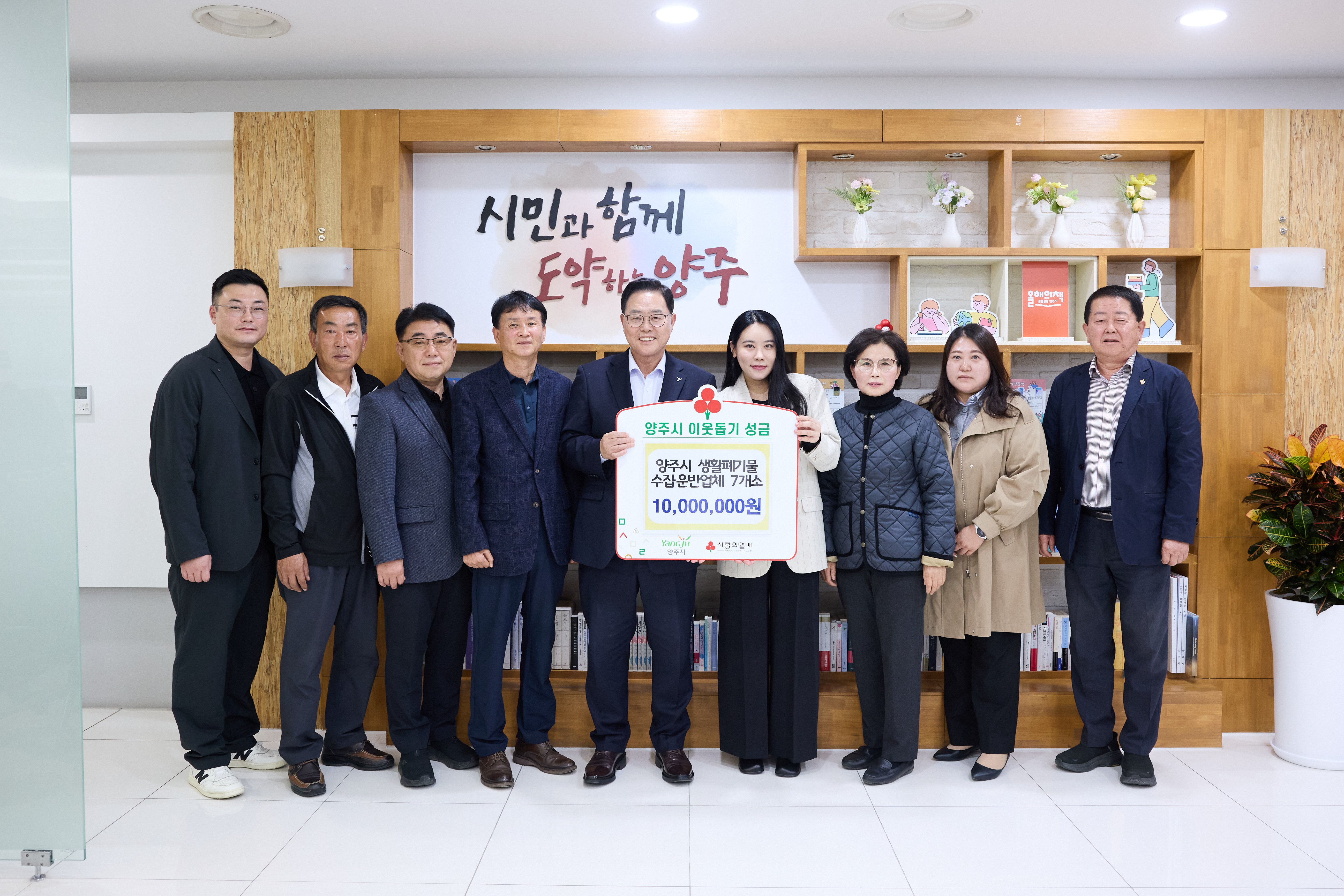 이번 성금은 양주환경㈜, ㈜크린양주, ㈜뉴하나개발, ㈜덕정환경, ㈜그린환경, ㈜친환경개발, ㈜성일환경(합) 등 7개 업체가 뜻을 모아 마련했다.