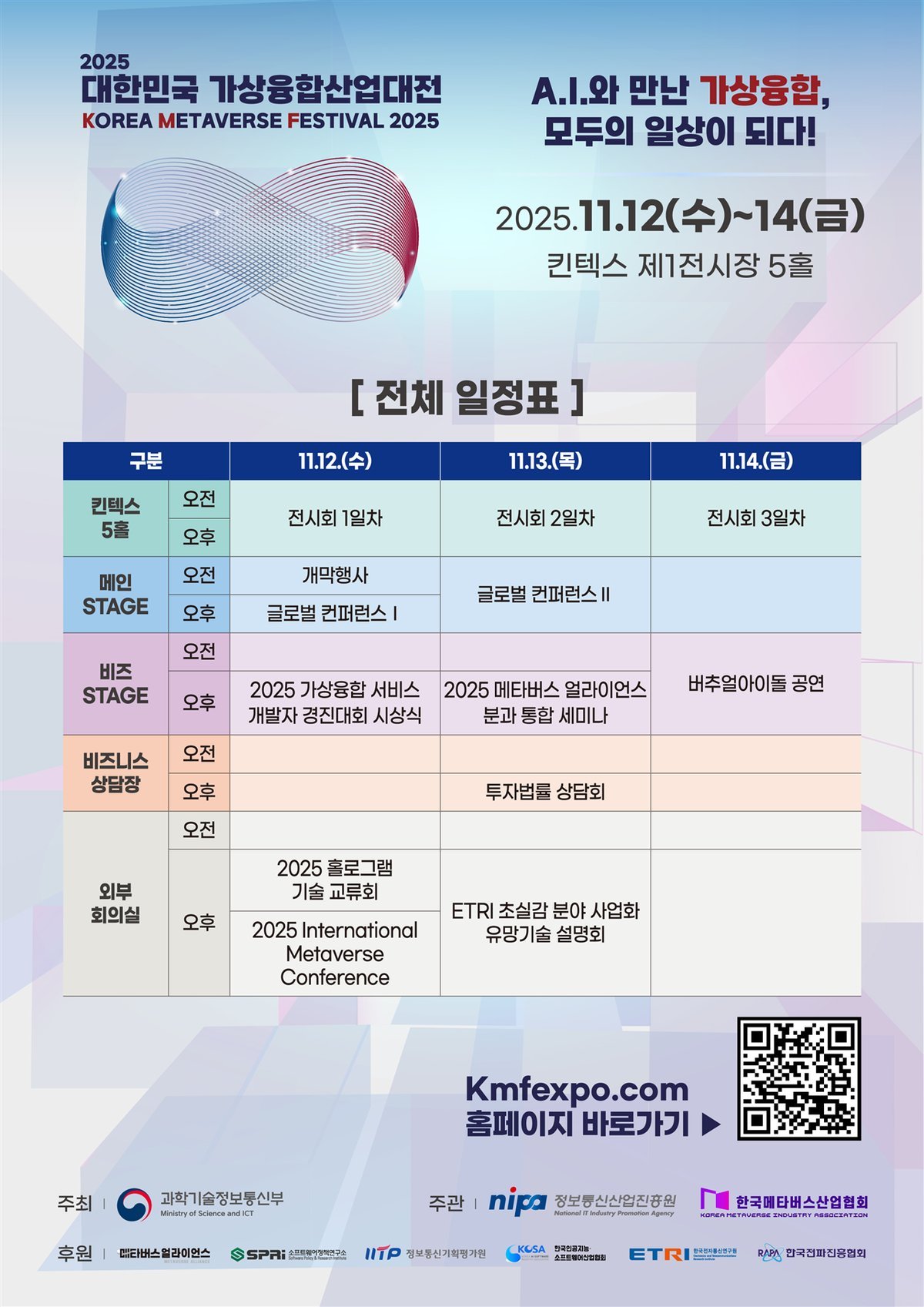 [PEDIEN] 과학기술정보통신부가 주최하는 국내 최대 규모의 가상융합산업 페스티벌, '2025 대한민국 가상융합산업대전'이 11월 12일부터 14일까지 일산 킨텍스 제1전시장에서 열린다.