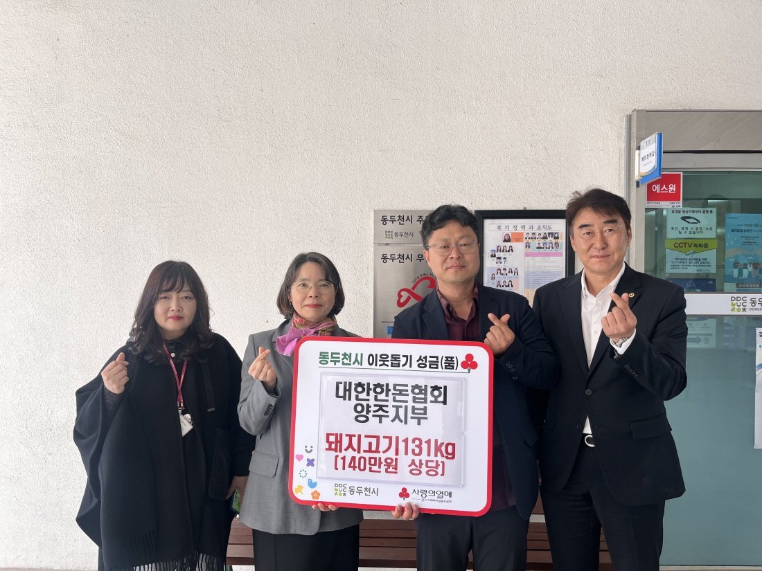 동두천시 복지정책과장은 “어려운 이웃을 위해 마음을 모아주신 한돈협회 양주지부에 깊이 감사드린다”며 “전달해주신 돼지고기는 도움이 필요한 분들께 정성껏 배부하겠다”고 전했다.