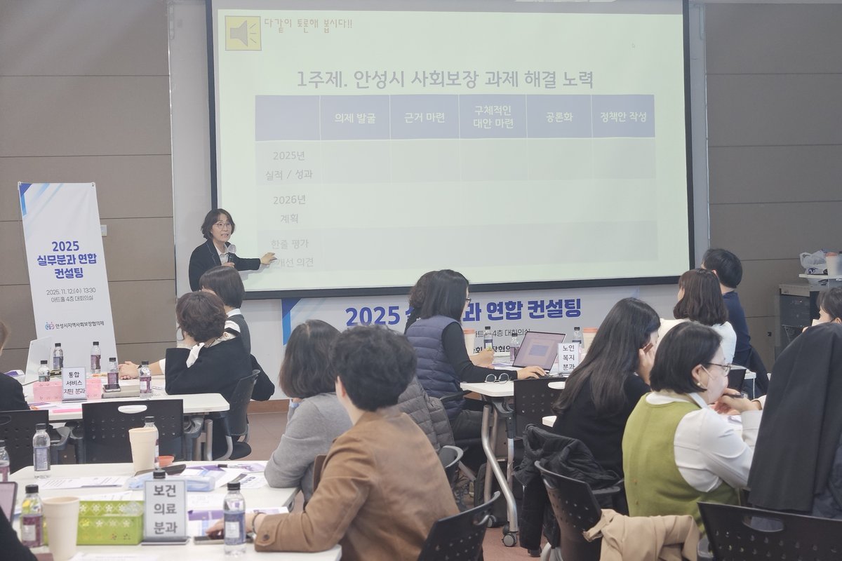 [PEDIEN] 지난 12일 안성시지역사회보장협의체 7개 실무분과 위원을 대상으로 2026년 운영계획을 수립하기 위한 연합컨설팅을 실시하였다. 이번 컨설팅은 올 한 해의 협의체 운영 전반을 점검하고 실무분과별 사업 추진 성과를 공유하며, 2026년 운영 방향과 핵심과제를 논의하기 위해 마련되었다.