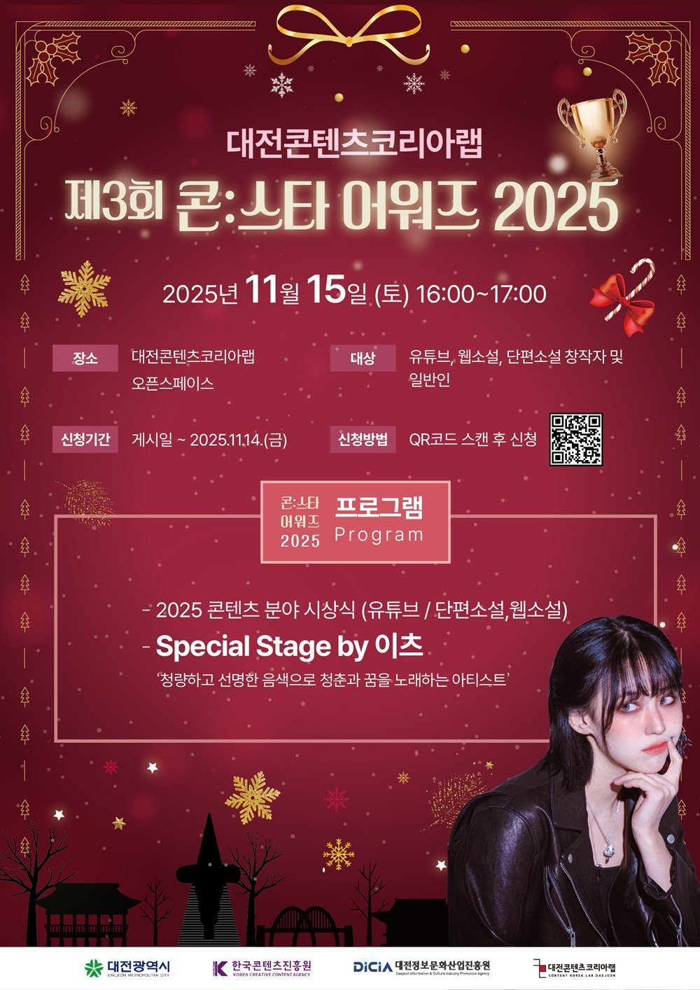 [PEDIEN] 대전시가 대전콘텐츠코리아랩에서 '2025 콘스타 어워즈'를 개최하고, 웹소설, 단편소설, 유튜브 분야에서 뛰어난 콘텐츠를 선보인 21개 팀에게 상을 수여했다.