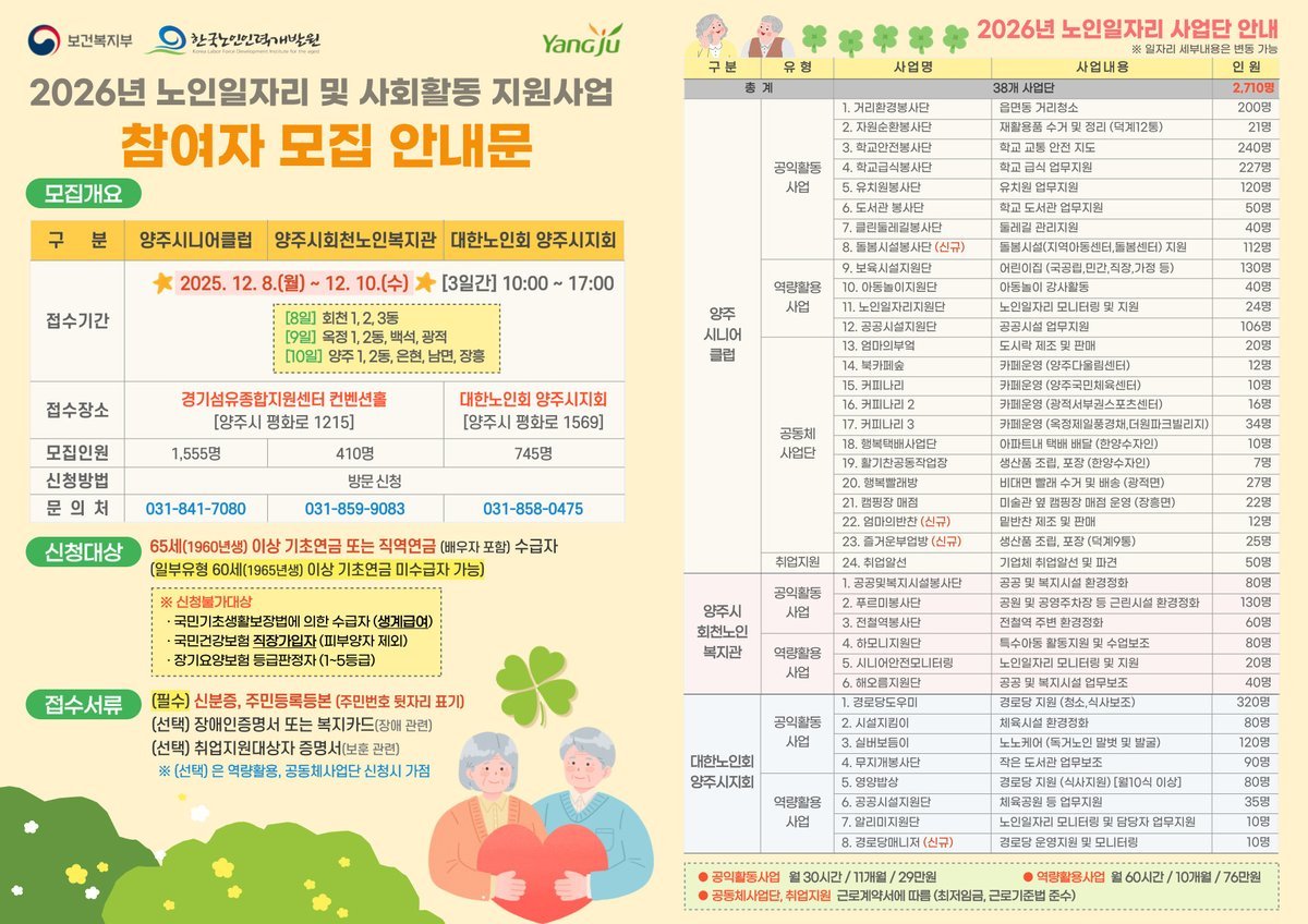 [PEDIEN] 양주시가 오는 12월 8일부터 10일까지 3일간 ‘2026년 노인일자리 및 사회활동 지원사업’참여자 2,710명을 모집한다.