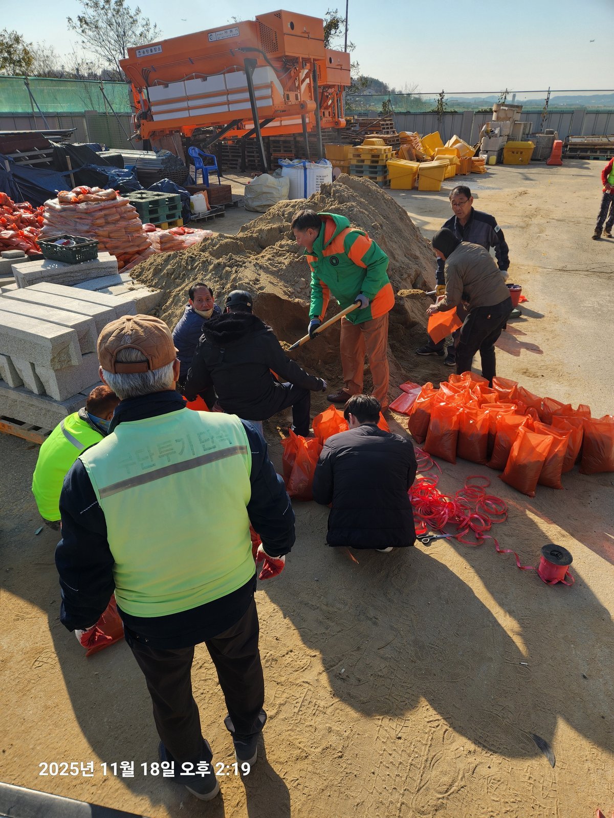 지산동 자율방재단은 지난 18일, 폭설에 대비하여 모래주머니 제작 작업에 돌입하고 주요 취약 지역 점검을 실시했다. 자율방재단원들은 급경사 및 결빙 취약 구역에 배치할 모래주머니 300여 개를 직접 만들었다.