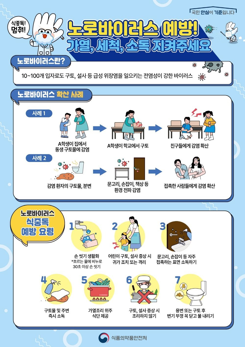 노로바이러스는 낮은 온도에서도 오래 생존하고 소량만으로도 감염을 일으키는 특성이 있어 11월부터 이듬해 4월까지 집중적으로 발생한다. 잠복기는 12~48시간이며 구토, 설사, 복통, 발열 등의 증상이 나타나며, 특히 영유아와 노약자는 증상이 심해질 수 있어 더욱 주의가 필요하다.