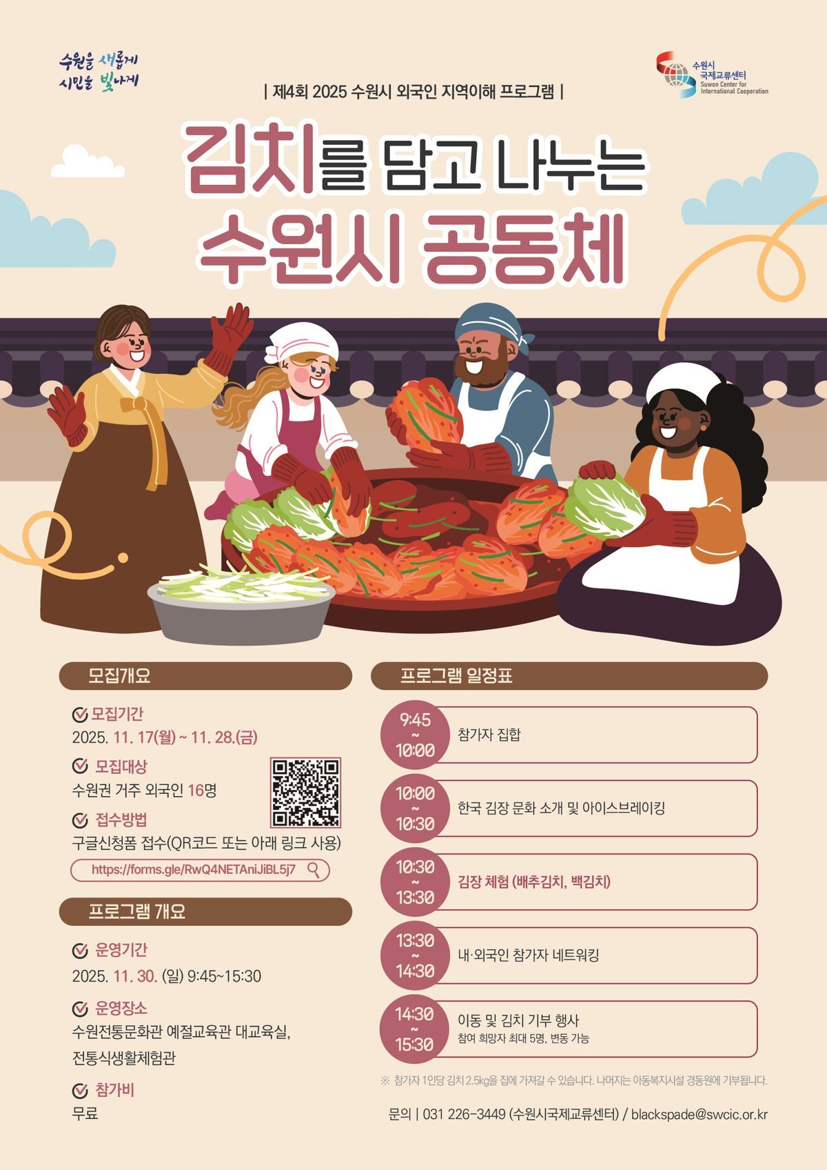 수원시국제교류센터는 '김치를 담고 나누는 수원시 공동체' 프로그램에 참여할 외국인 16명을 11월 28일까지 모집한다고 밝혔다. 이 프로그램은 수원시에 거주하는 외국인들을 대상으로 진행된다.