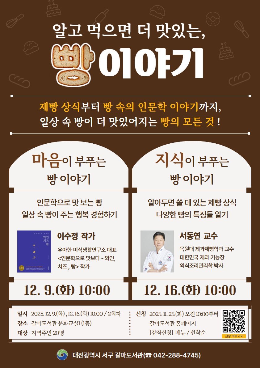 [PEDIEN] 대전 서구 갈마도서관은 ‘알고 먹으면 더 맛있는 빵 이야기’ 강좌를 운영한다고 24일 전했다.