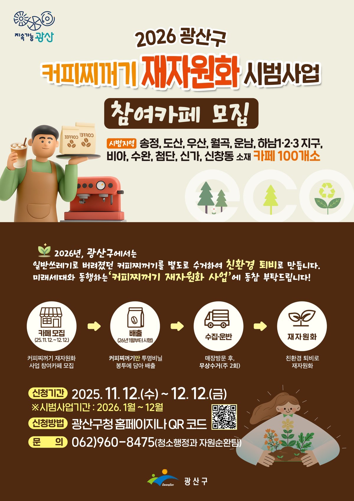 시범사업은 송정, 도산, 우산, 월곡, 비아, 첨단, 신가, 운남, 신창, 수완, 하남1·2·3 지구 등 14개 지구를 대상으로 진행된다. 참여를 원하는 커피전문점은 12월 12일까지 광산구 누리집 또는 정보무늬를 통해 신청할 수 있다.