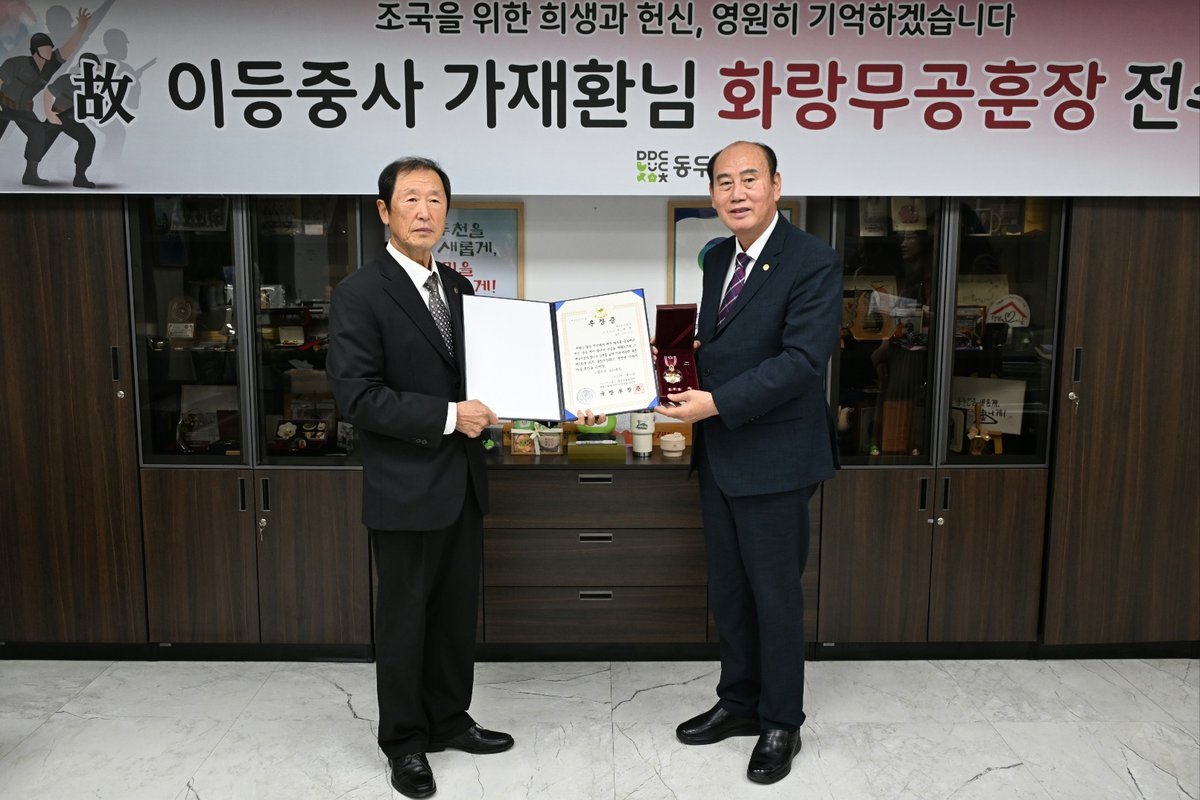 [PEDIEN] 동두천시가 6.25 전쟁 당시 금화지구 전투에서 용맹하게 싸다 전사한 故 가재환 이등중사에게 화랑무공훈장을 추서하고, 27일 시청 시장실에서 훈장 전수식을 거행했다.