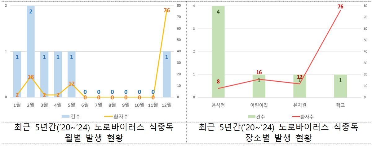 장소별로는 음식점에서 발생한 건수가 4건으로 가장 많았으나, 전체환자의 93%는 어린이집·유치원·학교 등 집단급식소에서 동시 발생했다.