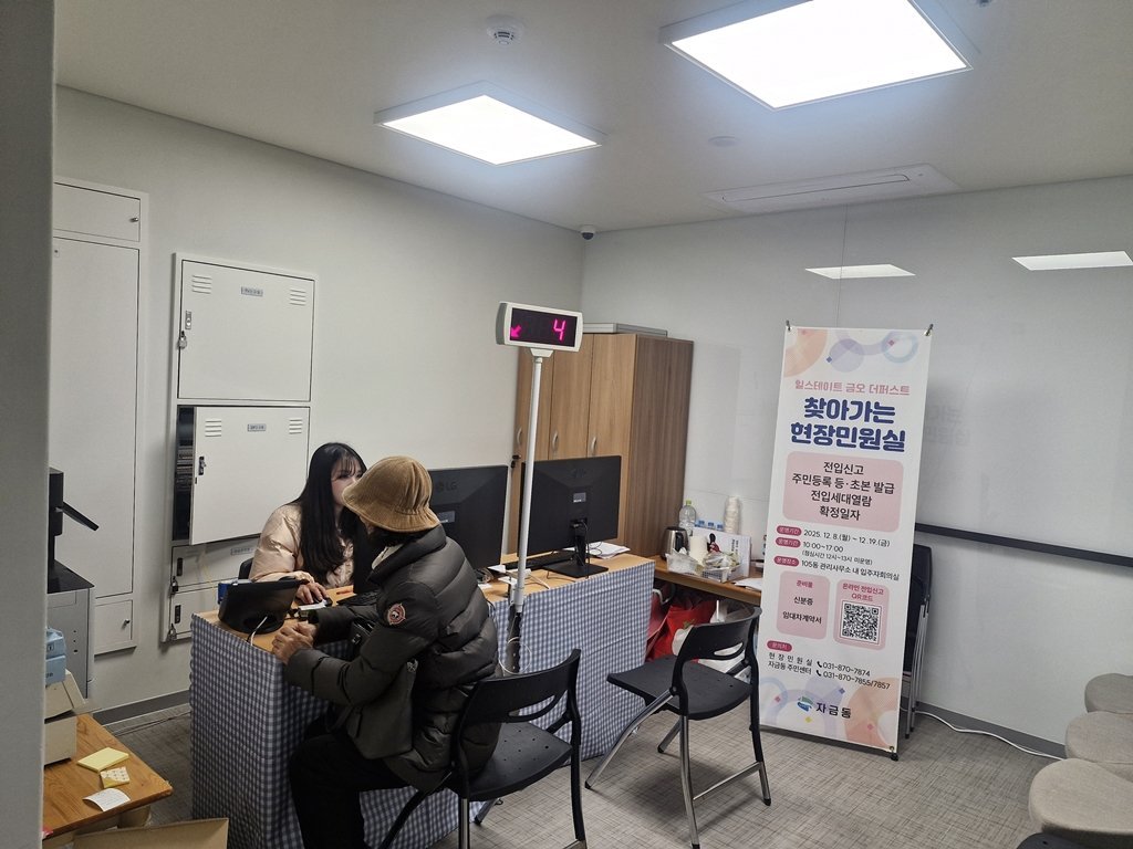 [PEDIEN] 의정부시 자금동주민센터는 신규 아파트 단지 입주가 본격화됨에 따라 입주민의 행정서비스 접근성을 높이고 초기 정착 과정의 불편을 최소화하기 위해 12월 8일부터 19일까지 ‘찾아가는 현장 민원실’을 운영한다.