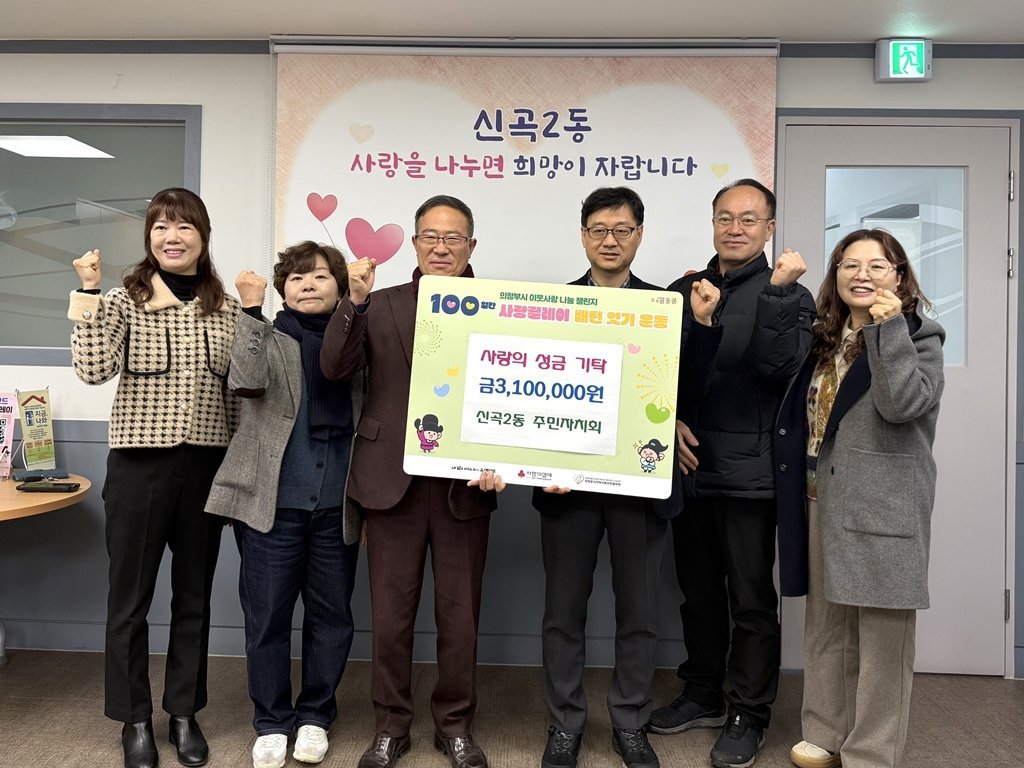 [PEDIEN] 의정부시 신곡2동 주민자치회가 12월 8일, '100일간 사랑릴레이 배턴 잇기'에 동참하며 310만원의 이웃돕기 성금을 기탁해 지역 사회에 훈훈함을 더했다.
