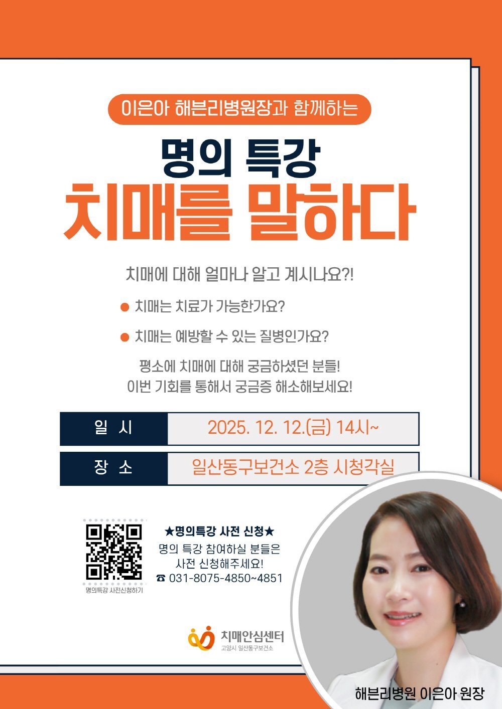 이번 강연은 신경과 전문의인 이은아 해븐리병원장을 초빙하여 '치매에 관한 궁금증 해소!'라는 주제로 진행된다. 12일 오후 2시, 일산동구보건소 시청각실에서 열리는 이번 특강은 치매에 대한 다양한 궁금증을 해소하고, 올바른 정보를 제공하는 데 초점을 맞춘다.