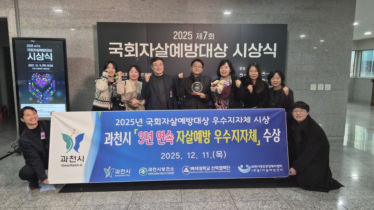 [PEDIEN] 과천시는 지난 11일 국회 의원회관 대회의실에서 열린 ‘제7회 국회자살예방대상’에서 기초지자체 부문 우수 지자체로 선정됐다고 밝혔다.