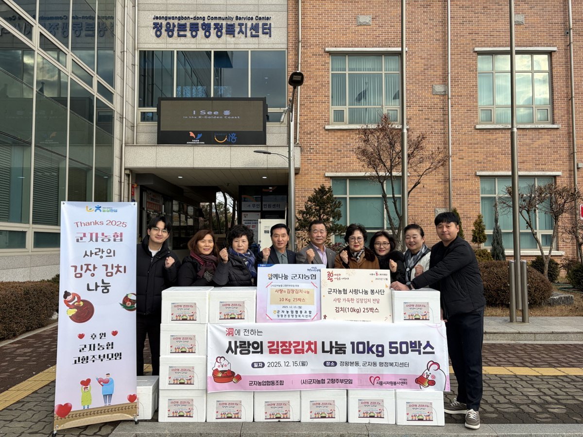 박래천 정왕본동장은 “매년 변함없이 나눔을 실천하는 군자농협 사랑나눔봉사단에 깊이 감사드린다”라며, “기탁된 김장 김치는 도움이 필요한 다문화가정과 취약계층에 소중히 전달해 지역사회 내 복지 체감도를 높이겠다”라고 말했다.