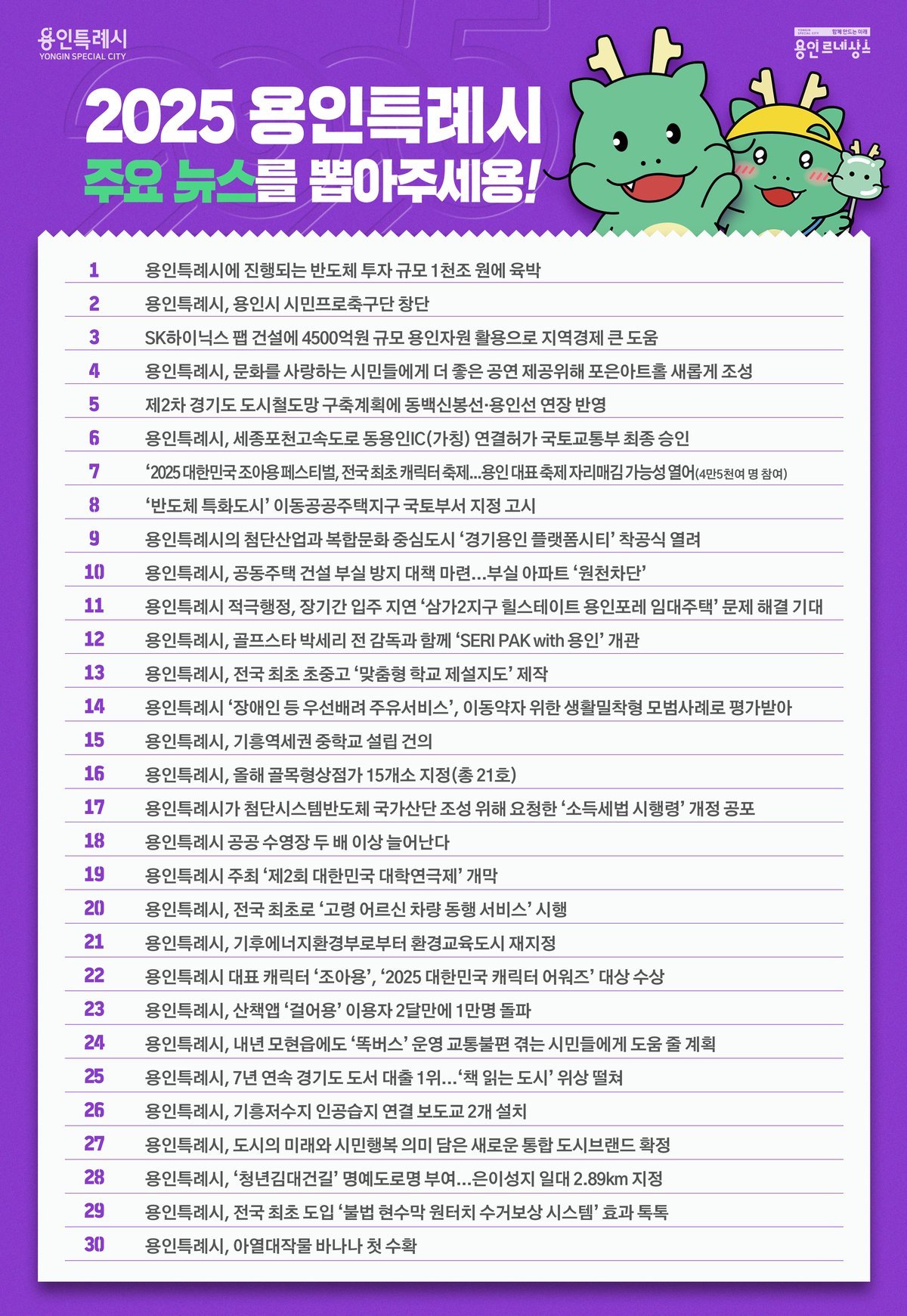 한편, 후보로 선정된 주요 뉴스는 △용인특례시에 진행되는 반도체 투자 규모 1천조 원에 육박 △용인특례시, 용인시 시민프로축구단 창단 △SK하이닉스 팹 건설에 4500억원 규모 용인자원 활용으로 지역경제 큰 도움 △용인특례시, 문화를 사랑하는 시민들에게 더 좋은 공연 제공위해 포은아트홀 새롭게 조성 △제2차 경기도 도시철도망 구축계획에 동백신봉선·용인선 연장 반영 △용인특례시, 세종포천고속도로 동용인IC 연결허가 국토교통부 최종 승인 △‘2025 대한민국 조아용 페스티벌, 전국 최초 캐릭터 축제...용인 대표 축제 자리매김 가능성 열어 △‘반도체 특화도시’이동공공주택지구 국토부서 지정 고시 △용인특례시의 첨단산업과 복합문화 중심도시 ‘경기용인 플랫폼시티’착공식 열려 △용인특례시, 공동주택 건설 부실 방지 대책 마련...부실 아파트 ‘원천차단’△용인특례시 적극행정, 장기간 입주 지연 ‘삼가2지구 힐스테이트 용인포레 임대주택’문제 해결 기대 △용인특례시, 골프스타 박세리 전 감독과 함께 ‘SERI PAK with 용인’개관 △용인특례시, 전국 최초 초중고 ‘맞춤형 학교 제설지도’제작 △용인특례시 ‘장애인 등 우선배려 주유서비스’, 이동약자 위한 생활밀착형 모범사례로 평가받아 △용인특례시, 기흥역세권 중학교 설립 건의 △용인특례시, 올해 골목형상점가 15개소 지정 △용인특례시가 첨단시스템반도체 국가산단 조성 위해 요청한 ‘소득세법 시행령’개정 공포 △용인특례시 공공 수영장 두 배 이상 늘어난다 △용인특례시 주최 ‘제2회 대한민국 대학연극제’개막 △용인특례시, 전국 최초로 ‘고령 어르신 차량 동행 서비스’시행 △용인특례시, 기후에너지환경부로부터 환경교육도시 재지정 △용인특례시 대표 캐릭터 ‘조아용’, ‘2025 대한민국 캐릭터 어워즈’대상 수상 △용인특례시, 산책앱 ‘걸어용’이용자 2달만에 1만명 돌파 △용인특례시, 내년 모현읍에도 ‘똑버스’운영 교통불편 겪는 시민들에게 도움 줄 계획 △용인특례시, 7년 연속 경기도 도서 대출 1위...‘책 읽는 도시’위상 떨쳐 △용인특례시, 기흥저수지 인공습지 연결 보도교 2개 설치 △용인특례시, 도시의 미래와 시민행복 의미 담은 새로운 통합 도시브랜드 확정 △용인특례시, ‘청년김대건길’명예도로명 부여...은이성지 일대 2.89km 지정 △용인특례시, 전국 최초 도입 ‘불법 현수막 원터치 수거보상 시스템’효과 톡톡 △용인특례시, 아열대작물 바나나 첫 수확 등 30개다.
