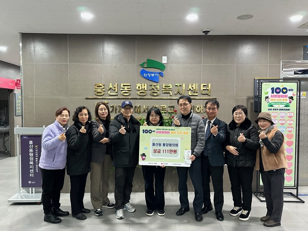 [PEDIEN] 의정부시 흥선동 행정복지센터는 12월 16일 흥선동통장협의회가 ‘100일간 사랑릴레이 배턴 잇기’에 동참해 관내 어려운 이웃들을 위한 성금 111만 원을 기탁했다고 밝혔다.