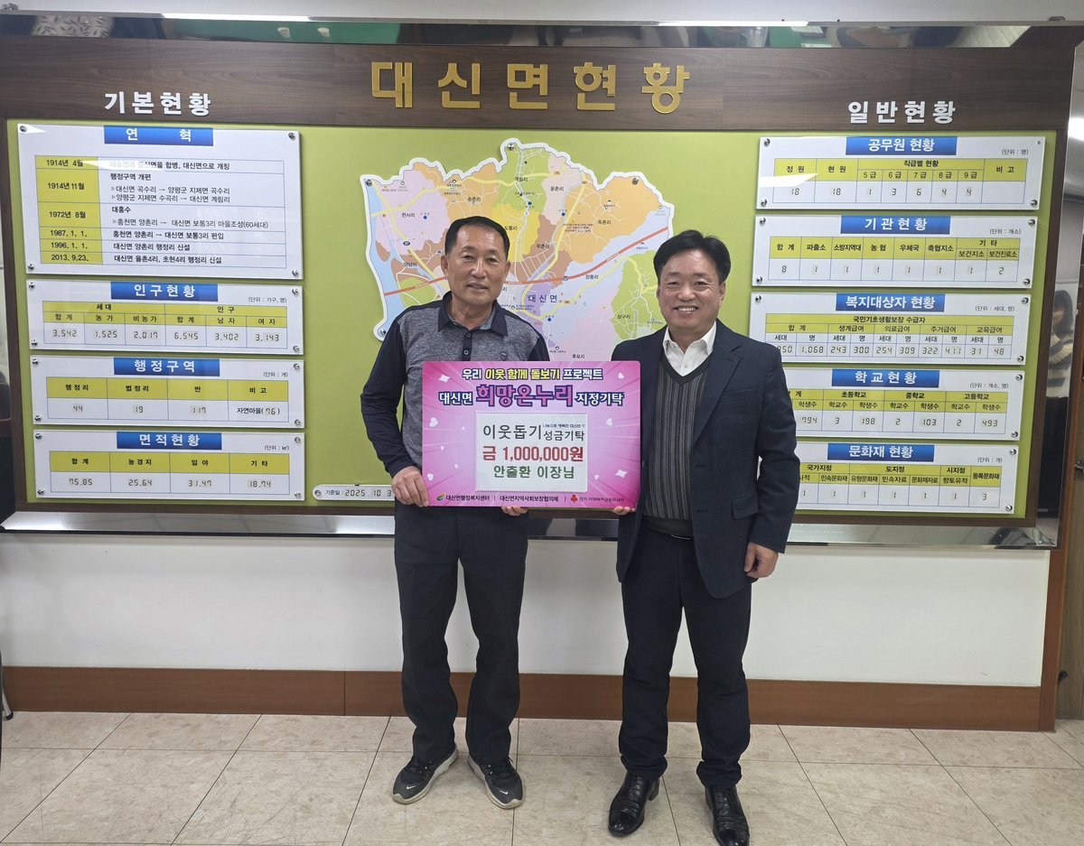 이상윤 대신면장은 안 이장의 따뜻한 마음에 감사를 표하며 “기탁해 주신 성금은 도움이 절실한 이웃들에게 소중히 전달하여 지역사회에 온기가 퍼질 수 있도록 하겠다”고 말했다.
