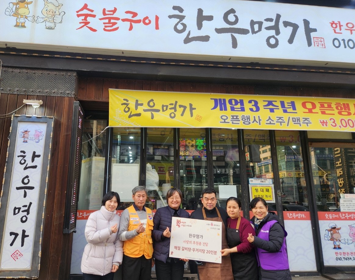 한우명가는 매월 정기적으로 갈비탕과 해장국 40인분을 정왕2동 행정복지센터에 기부하고 있으며, 기부된 음식은 독거노인 등 식사 준비에 어려움을 겪는 이웃들에게 전달되고 있다.