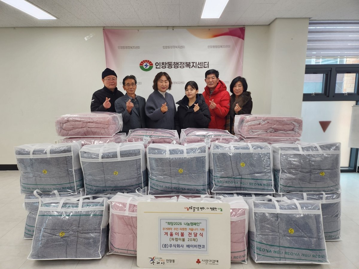 [PEDIEN] ㈜베이비캔코 권소미 대표가 지난 12월 17일, 구리시 인창동의 취약계층 주민들을 위해 겨울 이불 20채를 인창동 행정복지센터에 전달했다.