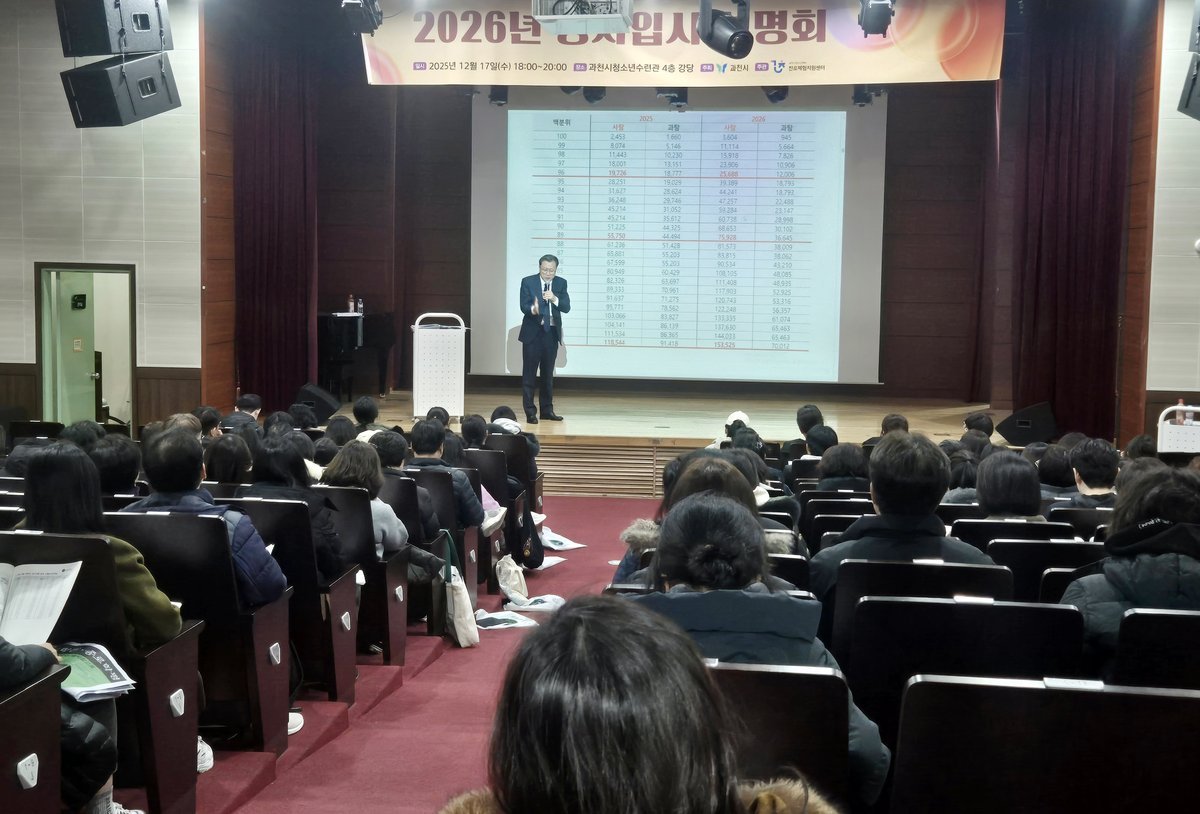 [PEDIEN] 과천시가 지난 17일 청소년수련관에서 2026학년도 대입 정시전형 대비 입시설명회를 개최했다. 설명회에는 관내 수험생과 학부모 200여 명이 참석하여 뜨거운 관심을 보였다.