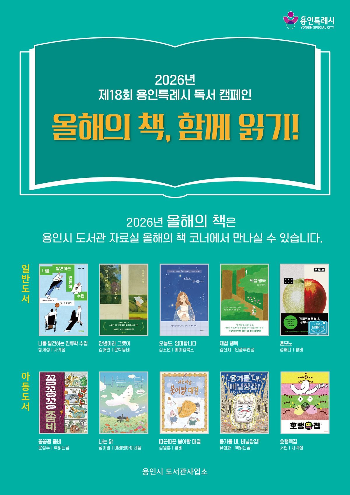 [PEDIEN] 용인특례시는 ‘나를 발견하는 인류학 수업’등 일반 도서 5권과 ‘꽁꽁꽁 좀비’등 아동도서 5권 등 총 10권을 ‘2026년 용인특례시 올해의 책’으로 선정했다고 9일 밝혔다.