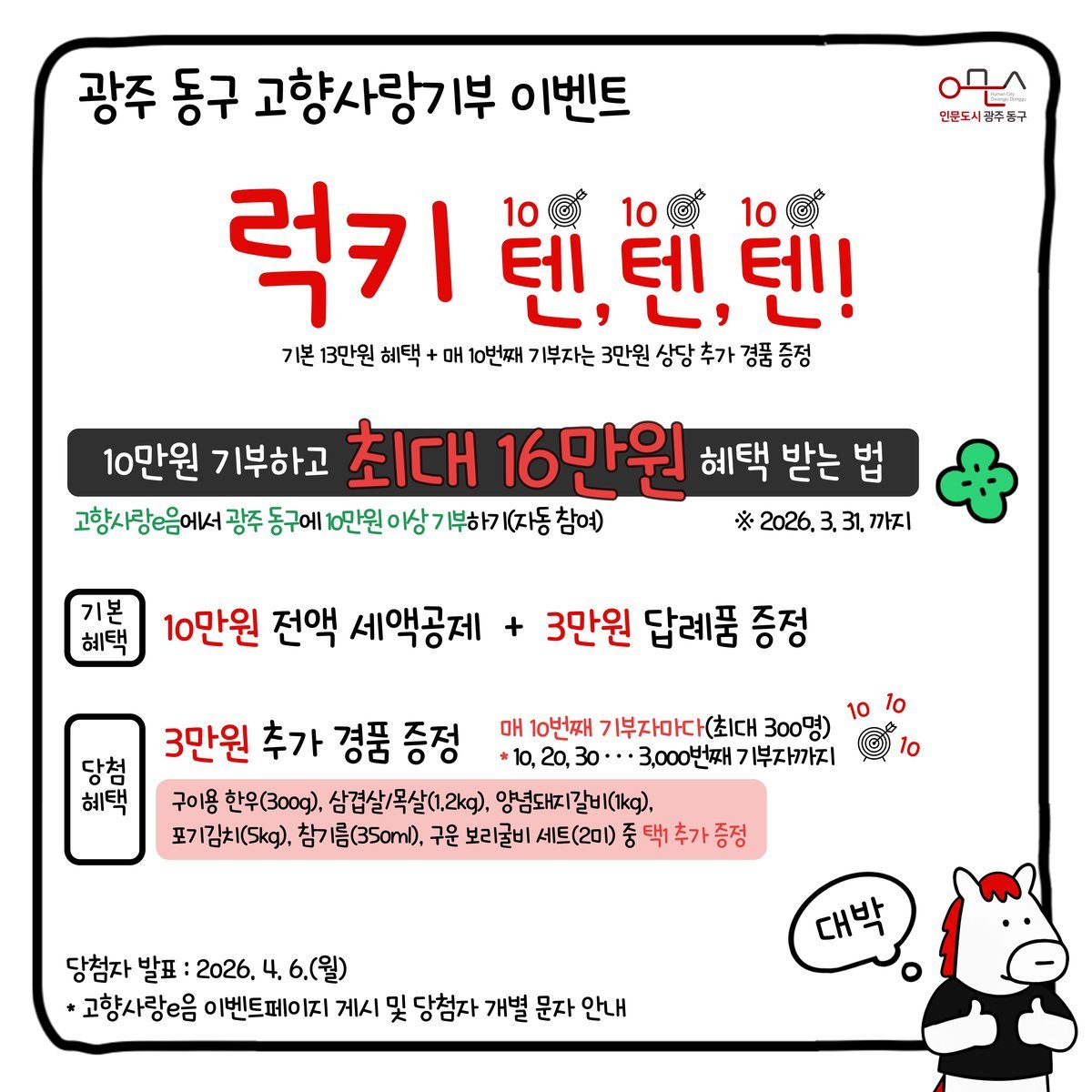 누적 기부 순서 기준으로 10번째, 20번째, 30번째 등 매 10번째 기부자에게 3만원 상당의 답례품을 추가 제공하며 최대 3000번째 기부자까지 총 300명이 혜택을 받게 된다.