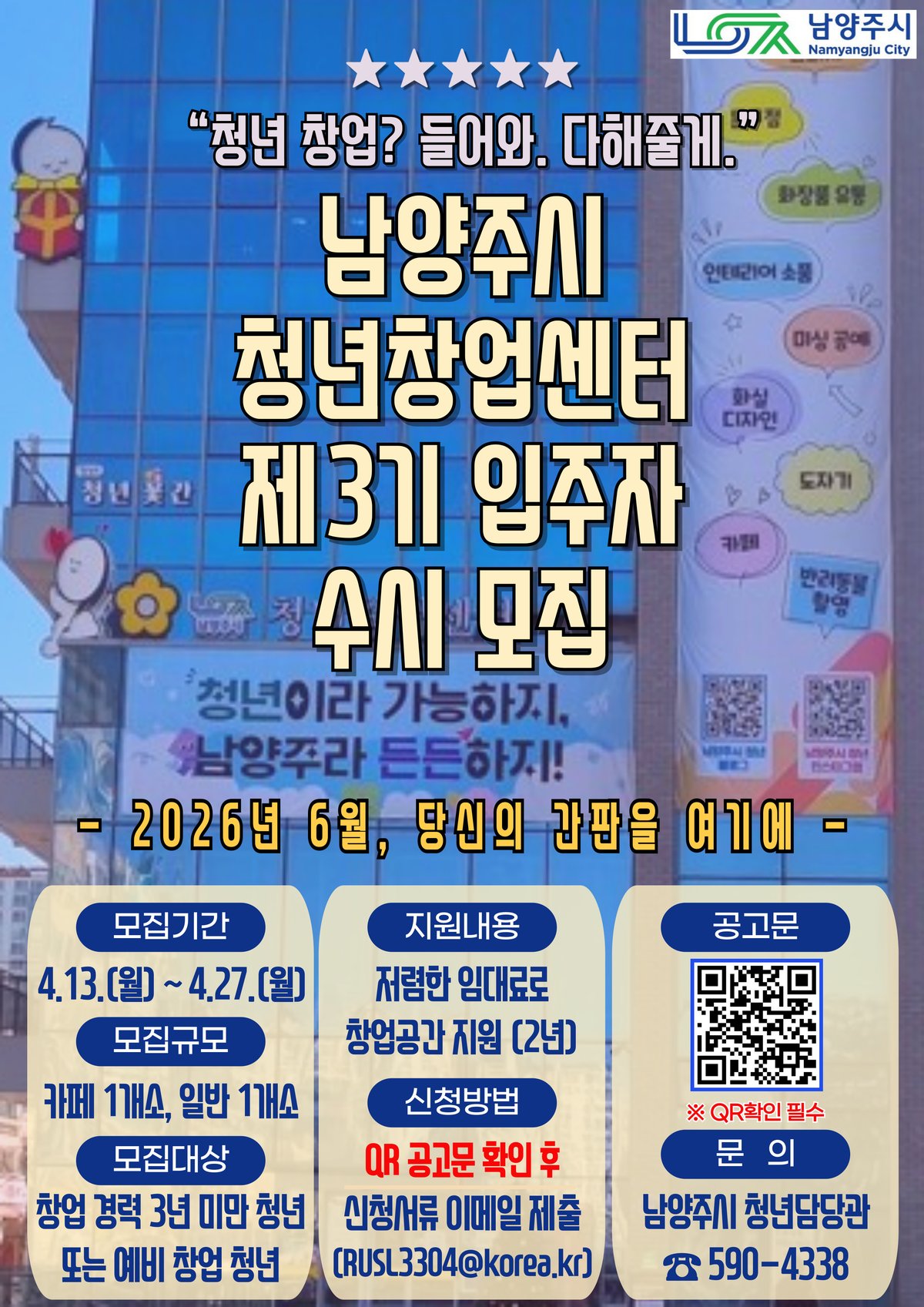 남양주시가 청년 창업가들의 안정적인 창업 도전을 위해 제3기 청년창업센터 입주자를 수시 모집한다.이번 수시 모집은 오는 4월 13일부터 시작되며, 시는 총 2개소를 선발할 계획이다. 102호는 카페 창업 분야, ...