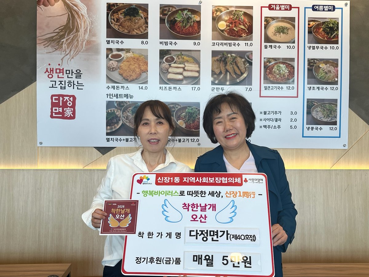 오산시 신장1동에 위치한 '다정면가'가 착한가게 40호점으로 지정됐다.신장1동 행정복지센터는 지난 24일 다정면가를 '착한날개 오산'으로 지정하고 인증 스티커 전달식을 가졌다. 지역사회 나눔 문화 확산에 기여한 공로를 인정받았다.'착한날개 오산'은 사회복지공동모금회를 통해 매월 3만원 이상을 정기적으로 기부하는 자영업자 또는 기업을 대상으로 하는 사업이다. 다정면가는 이번 지정으로 신장1동의 40번째 착한가게가 됐다.다정면가는 매월 5만원을 정기적으로 기부하기로 약정했다. 이 기부금은 신장1동 지역사회보장협의체를 통해 민관 협력 특화사업과 복지 사각지대 발굴 및 지원에 사용될 예정이다.이혜경 다정면가 대표는 “지역사회에 조금이나마 도움이 될 수 있어 기쁘다”며 소감을 밝혔다. 앞으로도 꾸준한 나눔 활동을 통해 어려운 이웃들에게 힘이 되고 싶다는 뜻을 전했다.이명숙 신장1동장은 나눔에 동참해 준 다정면가에 감사를 표했다. 기부자들의 따뜻한 마음이 지역사회를 변화시키는 큰 힘이 될 것이라며, 취약계층을 위한 실질적인 복지사업 추진에 더욱 힘쓰겠다고 강조했다.신장1동은 앞으로도 착한가게 발굴을 지속적으로 확대할 계획이다. 지역 내 나눔 문화 확산과 촘촘한 돌봄체계 구축을 위한 다양한 복지사업을 이어갈 예정이다. -