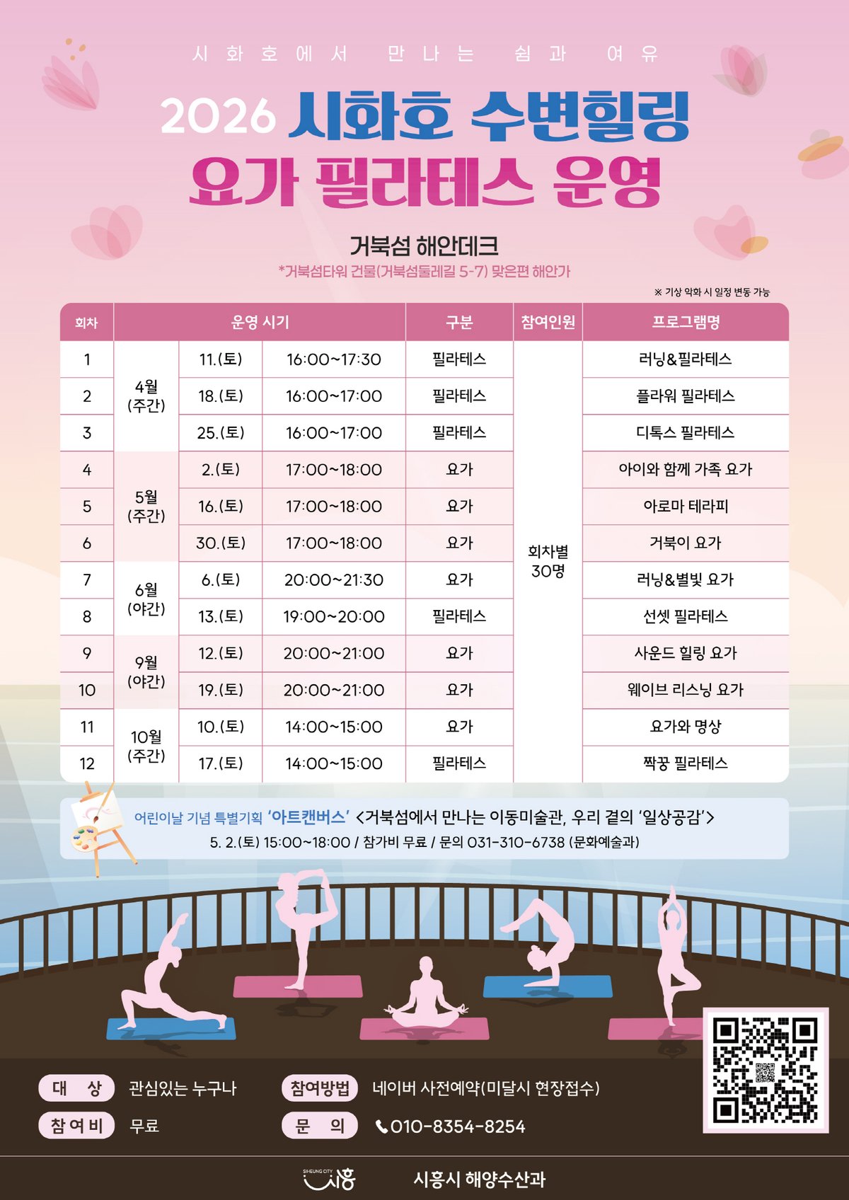 시흥시가 시화호 수변에서 시민들을 위한 특별한 힐링 프로그램을 운영한다. 4월 11일부터 10월 17일까지 진행되는 이번 프로그램은 아름다운 시화호의 자연경관을 배경으로 일상에 지친 시민들에게 여유와 휴식을 제공하는 데 목적을 둔다.거북섬 해안덱에서 총 12회에 걸쳐 진행되며, 회차별 30명씩 총 360명의 시민에게 기회가 주어진다. 프로그램은 주간과 야간으로 나뉘어 시간대별로 특색 있는 활동들로 채워질 예정이다. 자세한 일정은 시흥시 홍보 포스터를 통해 확인할 수 있다.주요 프로그램은 요가와 필라테스다. 누구나 쉽게 참여하여 즐길 수 있도록 구성했다. 탁 트인 자연 속에서 몸과 마음을 재충전할 수 있는 기회이며, 일부 회차에는 가벼운 러닝도 포함될 예정이다.특히 아로마, 꽃, 별빛 등 다채로운 주제를 프로그램에 접목해 참여자들에게 더욱 특별한 경험을 선사할 계획이다. 4월 1일부터 네이버 예약을 통해 상반기 프로그램 사전 예약이 가능하다. 선착순으로 신청을 받으며, 참가비는 무료다. 사전 예약 인원이 미달될 경우에는 당일 현장 신청도 할 수 있다.하반기 프로그램 사전 예약 일정은 8월 말 예약 페이지를 통해 공지될 예정이다. 시는 이번 프로그램을 통해 시화호 수변 공간을 시민 친화적인 여가 공간으로 활성화한다는 방침이다. 도심형 해양레저도시로서 시흥의 매력을 높이고, 지역 경제 활성화에도 기여할 것으로 기대하고 있다.윤진철 균형발전국장은 “시화호는 2025년 1월 유네스코 생태수문학 시범유역으로 선정될 만큼 국제적으로 가치를 인정받은 생태 자원”이라고 강조했다. 이어 “시민들이 아름다운 자연 속에서 건강한 여가를 즐길 수 있도록 다양한 프로그램을 확대해 나가겠다”고 밝혔다. -