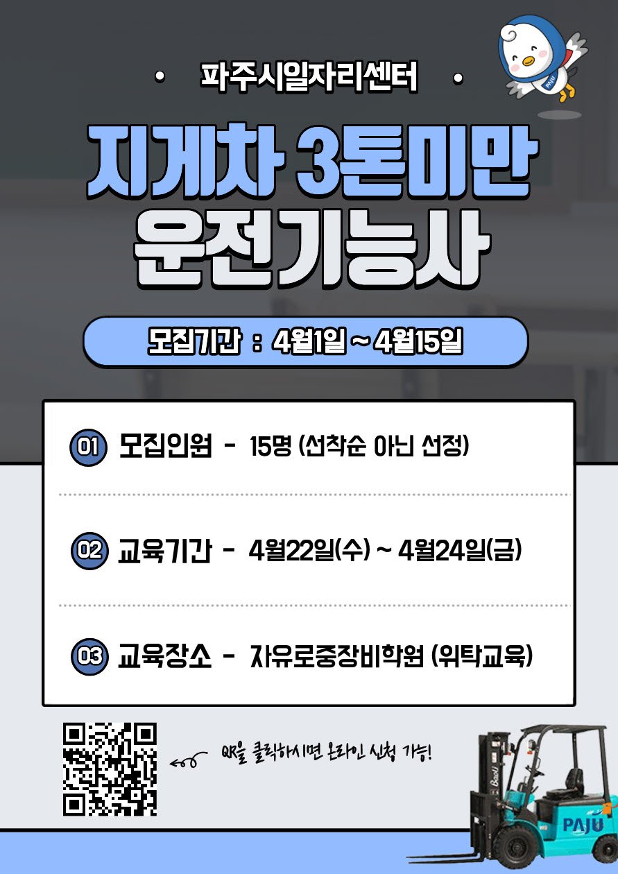 파주시, 중장년 재취업 지원…지게차 운전기능사 과정 참여자 모집
