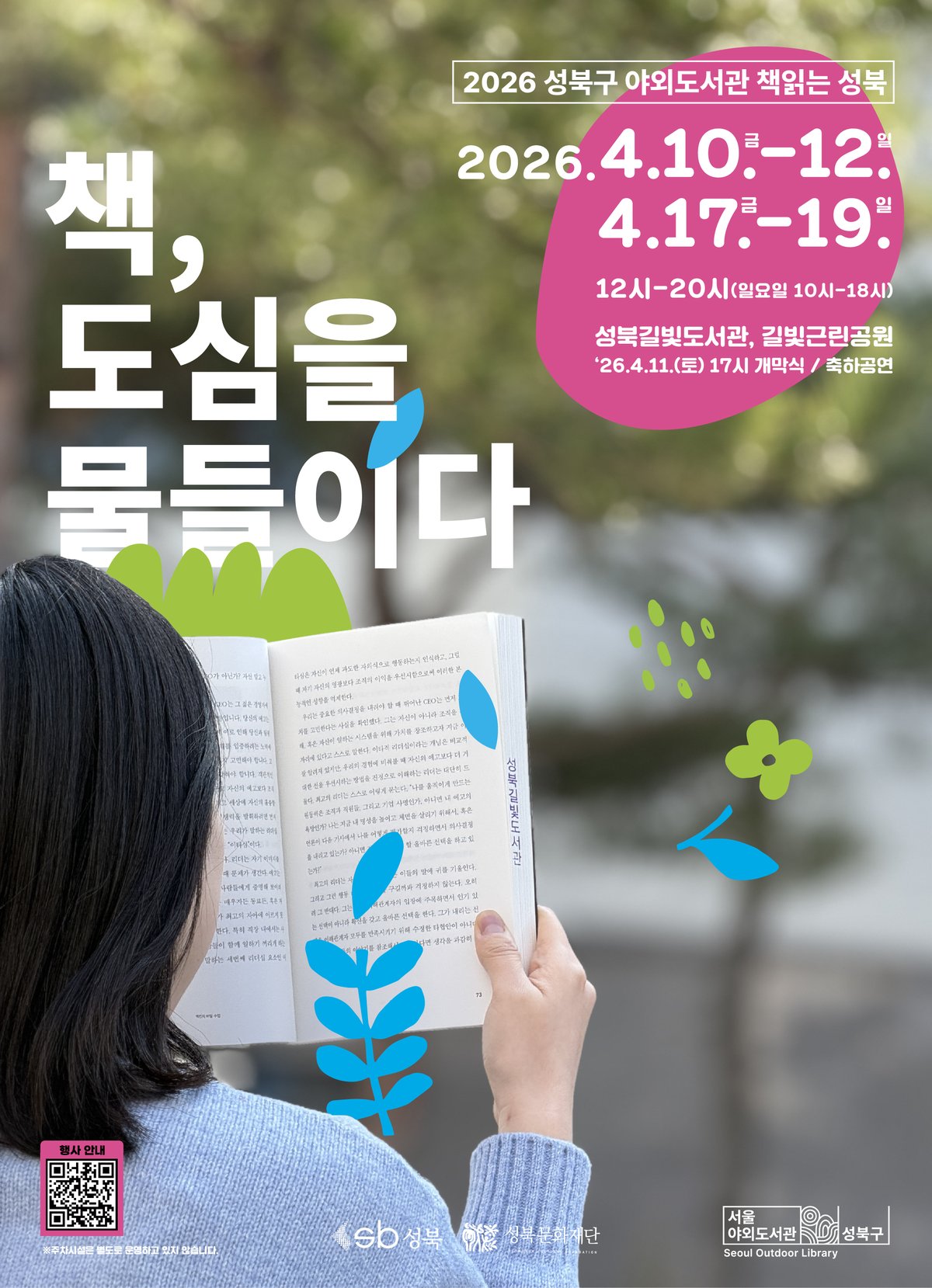 성북구가 2026년 상반기 '성북구 야외도서관 책읽는 성북'을 4월 10일부터 19일까지 운영한다. 책을 통해 도심에 활력을 불어넣는다는 취지다.지난해 가을, 길빛근린공원에 조성되어 큰 호응을 얻었던 야외도서관이 2026년 봄을 맞아 더욱 풍성한 프로그램으로 돌아온다. 금요일과 토요일은 오후 12시부터 8시까지, 일요일은 오전 10시부터 오후 6시까지 운영한다.'책, 도심을 물들이다'라는 주제로 운영되는 이번 야외도서관에서는 성북구 사서가 엄선한 3000여 권의 도서를 만날 수 있다. 공원 곳곳에 마련된 서가와 빈백을 활용하여 편안하게 책을 읽을 수 있는 공간을 제공한다. 지난해 큰 인기를 끌었던 오케스트라 공연을 비롯한 다채로운 공연과 독서문화 프로그램, 그리고 올해 새롭게 선보이는 '책멍존'도 준비되어 있다.특히 4월 11일 오후 5시에는 야외무대에서 개막식과 축하공연이 열릴 예정이다. 지역 대학과 협력한 오케스트라 공연이 진행될 예정이라 더욱 기대를 모은다.한편, 4월 3일부터 12일까지는 성북천 수변활력거점공간에서 소규모 팝업 야외도서관이 운영된다. 성북천을 산책하는 주민들이 잠시 쉬어가며 책과 공연을 즐길 수 있는 공간으로, 10일간 매일 오후 3시부터 8시까지 이용 가능하다.이승로 성북구청장은 "야외도서관은 구민 누구나 일상 가까이에서 책과 문화를 누릴 수 있는 열린 공간"이라고 강조했다. 덧붙여 "따스한 봄날, 가족과 이웃이 함께 책을 매개로 여유와 즐거움을 나누시길 바란다"며 "앞으로도 성북구는 구민의 일상에 독서와 문화가 자연스럽게 스며들 수 있도록 '책읽는 성북'을 더욱 확대해 나가겠다"고 밝혔다. 운영 일정은 기상 상황에 따라 변동될 수 있으며, 자세한 내용은 성북구립도서관 누리집에서 확인할 수 있다. -