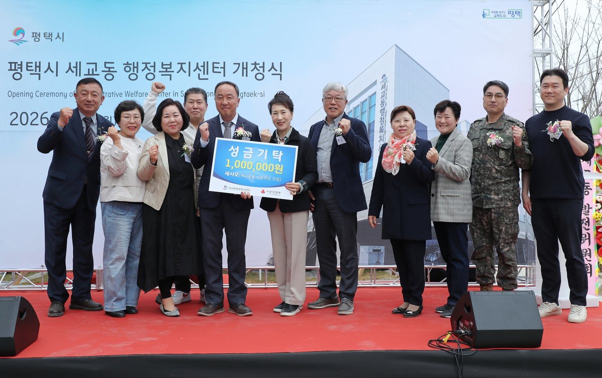 평택시 세교동 관내 봉사단체 ‘세사모’는 지난 30일 세교동 행정복지센터 개청식을 맞아 어려운 이웃을 위해 써달라며 성금 100만원을 기부했다.이번 성금은 개청식을 기념하고 지역 내 소외된 이웃들과 온정을 나누기 위해 회원들이 마련한 것으로 전달된 성금은 취약계층 지원 등에 사용될 예정이다.세사모 정종분 회장은 “개청식을 맞아 지역사회와 함께하는 뜻깊은 나눔에 동참하게 되어 매우 기쁘다”며 “앞으로도 세사모 회원들은 지역과 상생하며 지속적인 사회공헌 활동을 이어가겠다“라고 전했다. 김민수 세교동장은 “개청식을 빛내주시고 귀한 성금까지 기부하신 세사모 정종분 회장님과 회원들에게 깊은 감사의 말씀을 드린다”며 “전해주신 따뜻한 나눔의 손길은 우리 지역사회에 큰 울림을 주고 어려운 이웃들에게 희망과 용기를 전하는 소중한 밑거름이 될 것”이라고 말했다. -